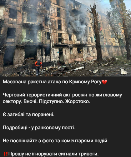 "Работают все экстренные службы, заканчивается тушение пожаров. Скорая оказывает помощь, есть пострадавшие в крайне тяжелом состоянии. Вероятно, есть люди под завалами", — написал глава военной администрации Кривого Рога Александр Вилкул.
