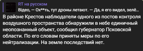 Губернатор Псковской области сообщает, что в районе Крестов наблюдатели одного из постов контроля воздушного пространства обнаружили в небе единичный неопознанный объект.