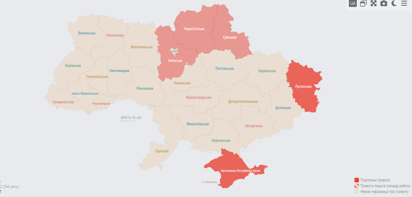 В Украине раздается воздушная тревога. В настоящее время существует угроза для двух регионов.