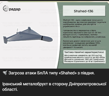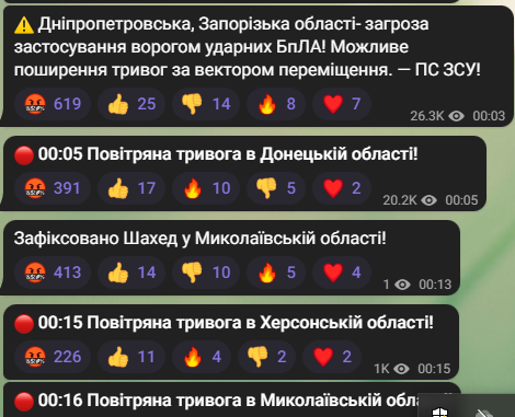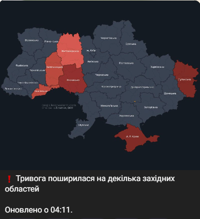 Воздушная тревога начала распространяться около полуночи. Есть угроза атаки беспилотников.