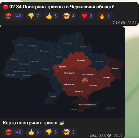 Мониторинговые каналы сообщают, что к карте воздушных тревог добавилась Черкасская область.