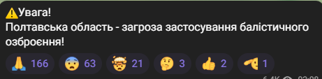 Воздушные Силы Украины сообщают об угрозе баллистики в Полтавской области.