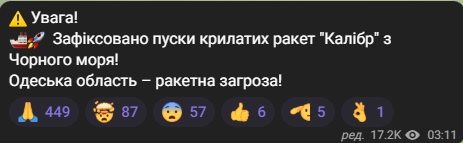 Сообщается, что враг применяет и крылатые ракеты "Калибр". Под угрозой — Одесская область.