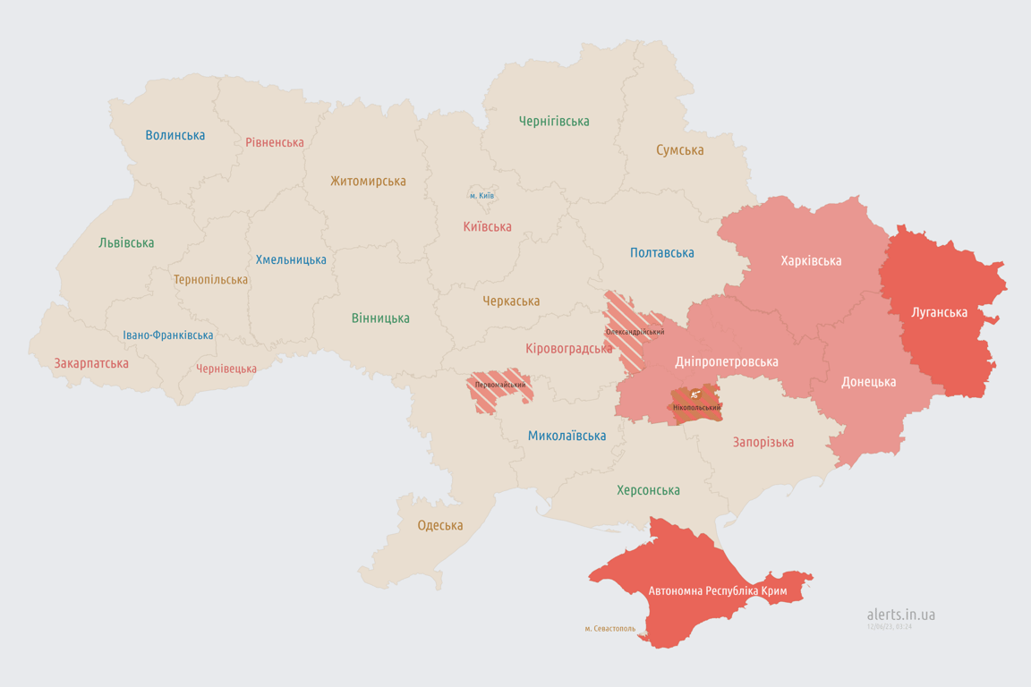 Обновлено 03:24. В настоящее время воздушная тревога продолжается в таких областях: Запорожская, Днепропетровская, Донецкая и часть Кировоградской.