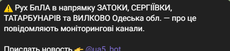 Мониторинговые каналы сообщают, что существует угроза применения БпЛА типа "Shahed" с юга.