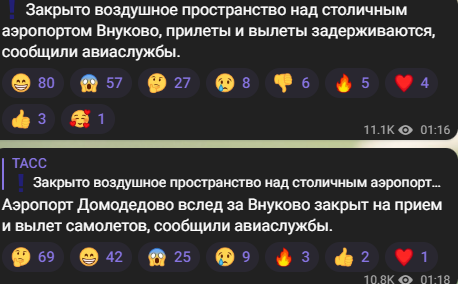 В то же время, "ТАСС" сообщил со ссылкой на авиаслужбы, что московские аэропорты "Домодедово" и "Внуково" временно закрыты на прием и вылет самолетов.