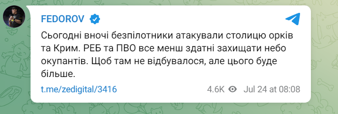"Сегодня ночью беспилотники атаковали столицу орков и Крым. РЭБ и ПВО все менее способны защищать небо оккупантов. Чтобы там не происходило, но этого будет больше", — заверил министр.