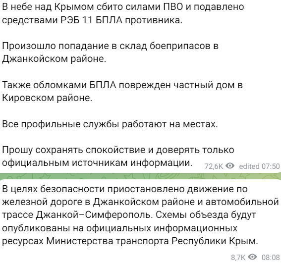 "В целях безопасности приостановлено движение по железной дороге в Джанкойском районе и автомобильной трассе Джанкой — Симферополь. Схемы объезда будут опубликованы на официальных информационных ресурсах Министерства транспорта Республики Крым", — добавил предатель.