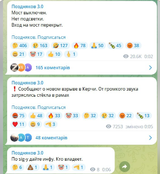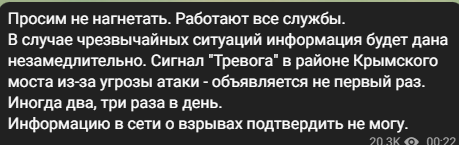 Мониторинговые каналы сообщают, что около 24:00 вблизи Крымского моста раздались взрывы.
