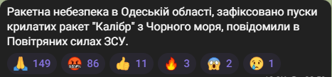 Воздушные силы Украины сообщают о пусках ракет "Калибр" из Черного моря.