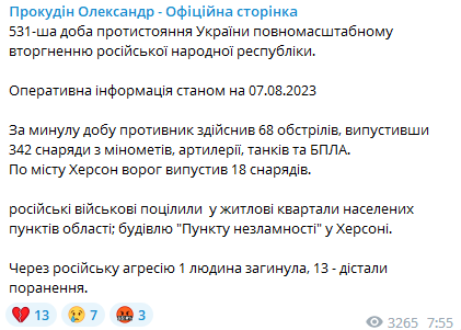 Прокудин также рассказал, что враг выпустил 18 снарядов по Херсону. В городе было попадание в здание "Пункта несокрушимости".