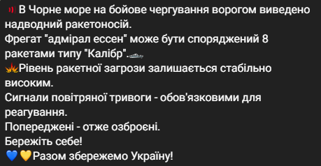 "В Черное море на боевое дежурство враг вывел надводный ракетоноситель. Фрегат "Адмирал Эссен" может быть снаряжен восемью ракетами типа "Калибр", – говорится в заявлении.