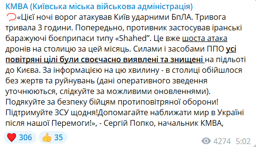 "Силами и средствами ПВО все воздушные цели были своевременно обнаружены и уничтожены на подлете в Киев. По информации на эту минуту — в столице обошлось без жертв и разрушений", — говорится в сообщении.