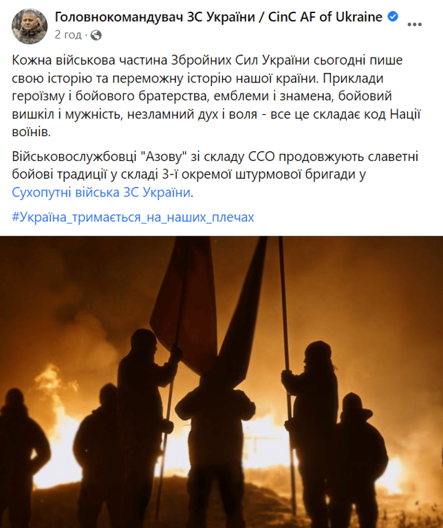 "Каждая военная часть Вооруженных сил Украины сегодня пишет свою историю и победоносную историю нашей страны. Примеры героизма и боевого братства, эмблемы и знамена, боевая выучка и мужество, несгибаемый дух и воля — все это составляет код Нации воинов. Военнослужащие "Азова" из состава ССО продолжают знаменитые боевые традиции в составе 3-й отдельной штурмовой бригады Сухопутных войск ВС Украины", — отметил главнокомандующий ВСУ.