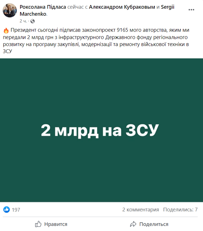 "Президент сегодня подписал законопроект 9165 моего авторства, которым мы передали 2 млрд грн из инфраструктурного Государственного фонда регионального развития на программу закупки, модернизации и ремонта военной техники в ВСУ", — написала она.