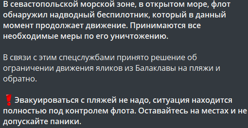 "У севастопольській морській зоні, у відкритому морі, флот виявив надводний безпілотник, який зараз продовжує рух. Вживаються всі необхідні заходи щодо його знищення", — йдеться у повідомленні.