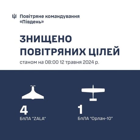 "Упродовж минулої доби, 11 травня 2024 року, підрозділами протиповітряної оборони півдня України знищено 5 російських розвідувальних БпЛА – 4 "ZALA" на Херсонщині та "Орлан-10" на Миколаївщині", — йдеться в повідомлені Повітряних Сил.