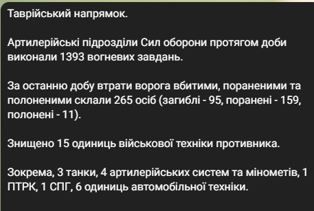 "За останню добу втрати ворога вбитими, пораненими та полоненими склали 265 осіб (загиблі — 95, поранені — 159, полонені — 11)", — йдеться в повідомленні.