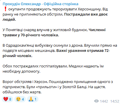 За словами Прокудіна, у селі Понятівка снаряд влучив у житловий будинок. Численні травми отримав 70-річний чоловік. В Одрадокам’янці вибухівку скинули з дрона і влучили на подвір’я місцевих мешканців. Важкі поранення отримав 72-річний чоловік.