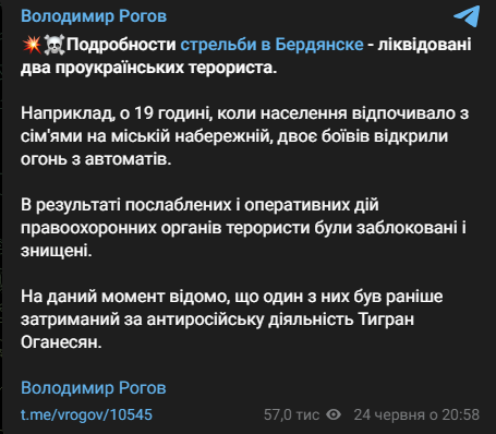 "Приблизно о 19-й годині, коли населення відпочивало з сім'ями на міській набережній, двоє бойовиків відкрили вогонь з автоматів. Унаслідок злагоджених та оперативних дій правоохоронних органів терористів було блоковано та знищено", — написав Володимир Рогов.
