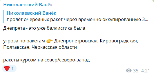 Оновлено 04:22. Моніторинговий канал "Николаевский Ванек" повідомляє, що Дніпро обстрілює балістика.