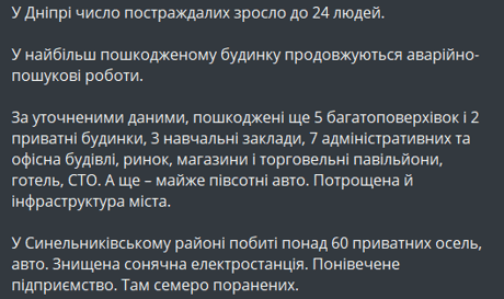 Лисак розповів, що в Дніпрі через обстріли росіян число постраждалих зросло до 24 людей. Крім того, пошкоджені ще п'ять багатоповерхівок і два приватні будинки, три навчальні заклади, сім адміністративних та офісна будівлі, ринок, магазини і торговельні павільйони, готель, СТО. А ще — майже півсотні авто. Потрощена й інфраструктура міста.