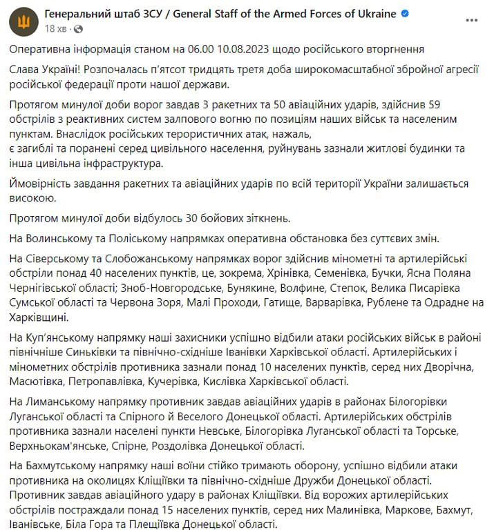Розпочалась 533 доба повномасштабного російського вторгнення на територію України. За день окупанти завдали три ракетні та 50 авіаційних ударів, а також близько 60 обстрілів з РСЗВ.