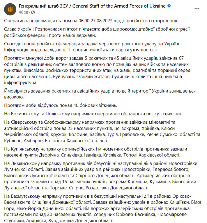Розпочалася 550 доба повномасштабного російського вторгнення на територію України. Упродовж дня окупанти завдали п'ять ракетних та 45 авіаційних ударів, а також близько 70 обстрілів з РСЗВ.