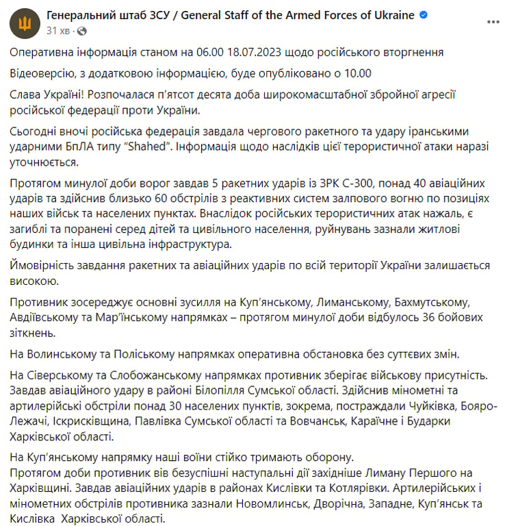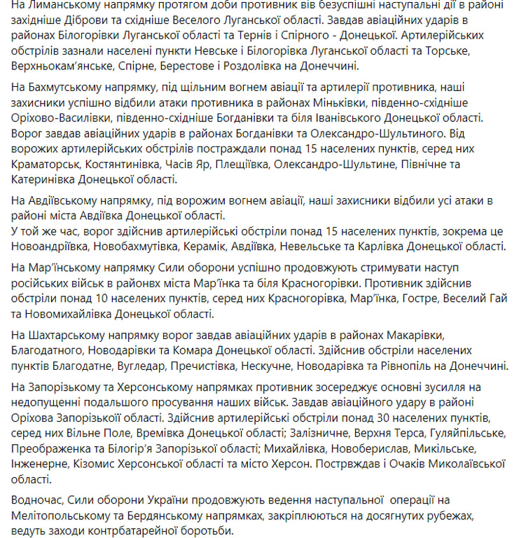 За минулу добу на передовій відбулося 36 бойових зіткнень. Російські окупанти зосереджують основні зусилля на Куп'янському, Лиманському, Бахмутському, Авдіївському та Мар’їнському напрямках. Крім того, сьогодні вночі Росія атакувала Україну БпЛА типу Shahed та ракетами.