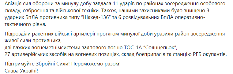 "Підрозділи ракетних військ і артилерії протягом минулої доби уразили район зосередження живої сили противника, дві важких вогнеметних системи залпового вогню ТОС-1А "Солнцепьок", 27 артилерійських засобів на вогневих позиціях, склад боєприпасів та станцію РЕБ окупантів", — зазначили в Генштабі.