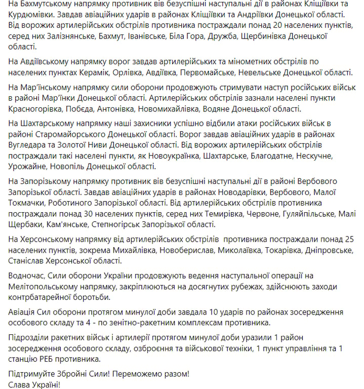 "Підрозділи ракетних військ і артилерії протягом минулої доби уразили 1 район зосередження особового складу, озброєння та військової техніки, 1 пункт управління та 1 станцію РЕБ противника", — додали в Генштабі.