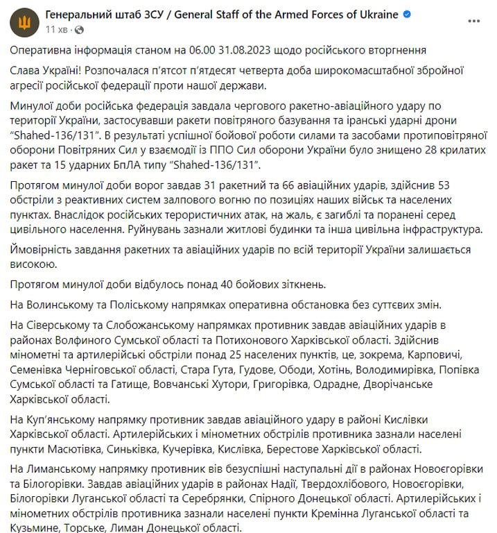 Розпочалася 554 доба повномасштабного російського вторгнення на українські землі. За добу РФ атакувала Україну за допомогою БпЛА та ракет, а також здійснила понад 65 авіаційних ударів і понад 50 — з РСЗВ. Своєю чергою ЗСУ завдали близько 15 ударів по окупантах та їхній техніці.