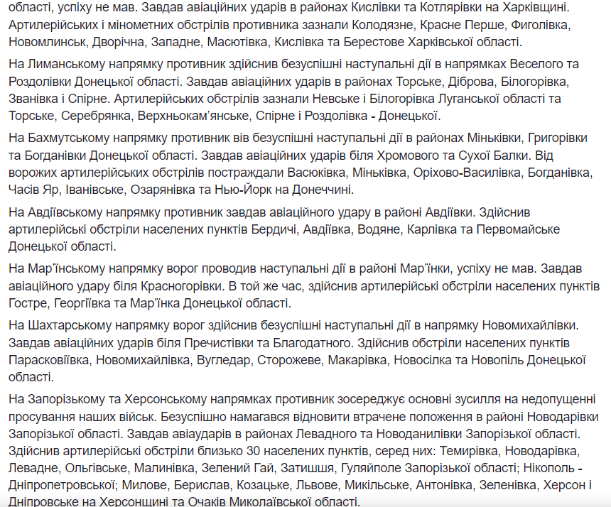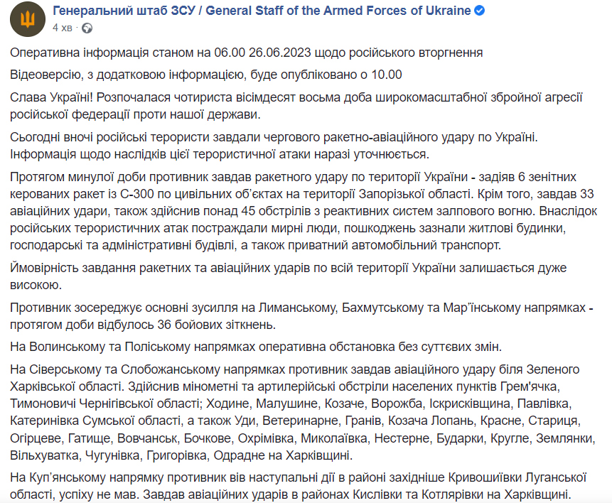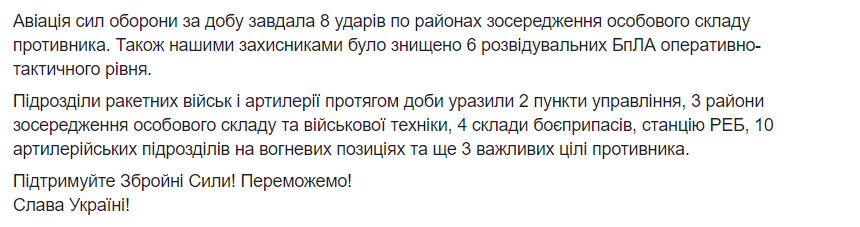 "Підрозділи ракетних військ і артилерії протягом доби уразили 2 пункти управління, 3 райони зосередження особового складу та військової техніки, 4 склади боєприпасів, станцію РЕБ, 10 артилерійських підрозділів на вогневих позиціях та ще 3 важливі цілі противника", — йдеться в повідомленні.
