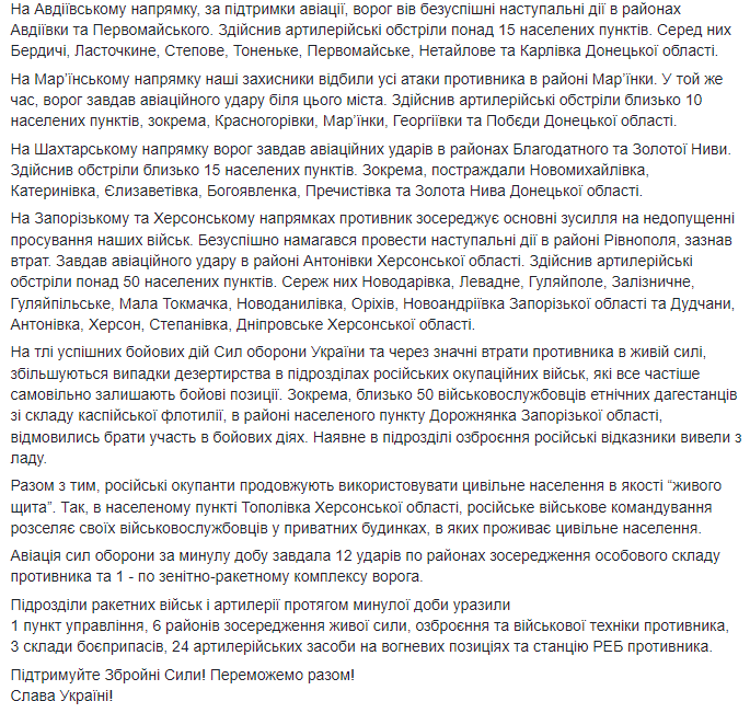 Зазначається, що впродовж доби окупанти також здійснили понад 50 обстрілів із РСЗВ по позиціях ЗСУ, а також військових та цивільних об'єктах інфраструктури в Луганській, Донецькій, Запорізькій та Херсонській областях.
