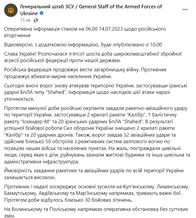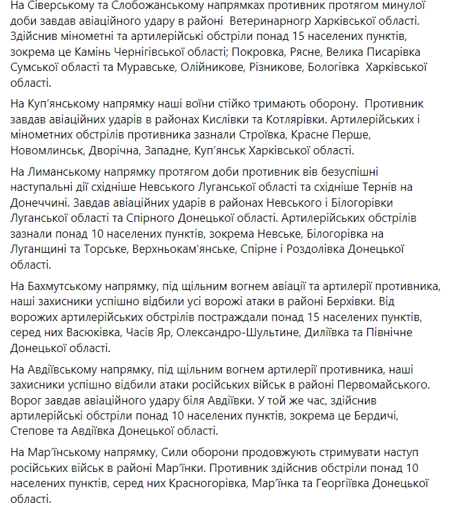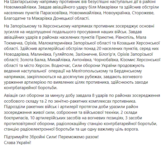 "Підрозділи ракетних військ і артилерії протягом доби уразили район зосередження живої сили, озброєння та військової техніки, 2 склади боєприпасів, 10 артилерійських засобів на вогневих позиціях, 3 засоби протиповітряної оборони, радіолокаційну станцію контрбатарейної боротьби, станцію радіоелектронної боротьби та ще одну важливу ціль ворога", — йдеться в повідомленні.