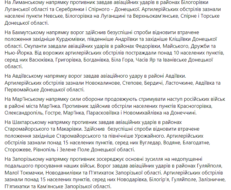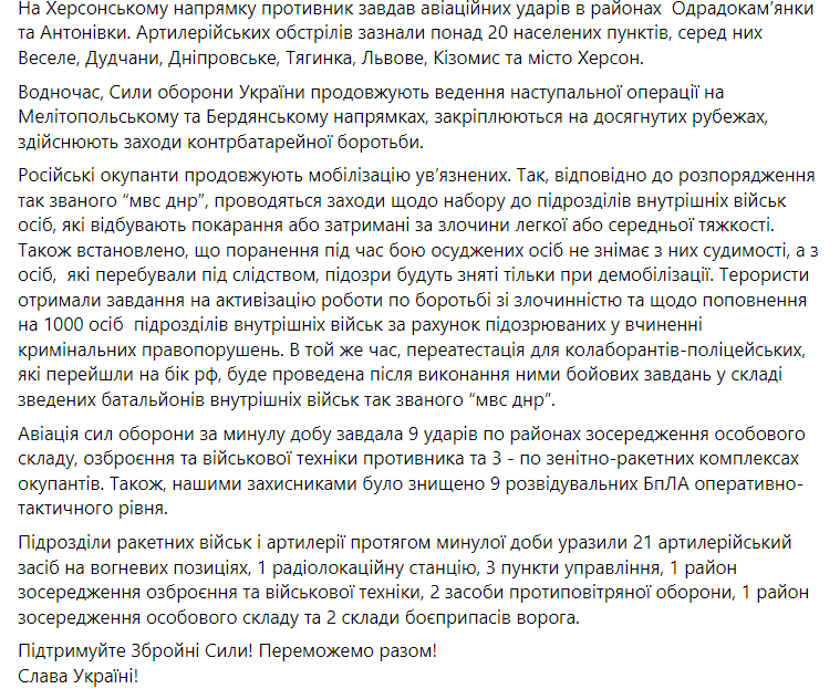 "Підрозділи ракетних військ і артилерії протягом минулої доби уразили 21 артилерійський засіб на вогневих позиціях, 1 радіолокаційну станцію, 3 пункти управління, 1 район зосередження озброєння та військової техніки, 2 засоби протиповітряної оборони, 1 район зосередження особового складу та 2 склади боєприпасів ворога", — йдеться в повідомленні Генштабу.