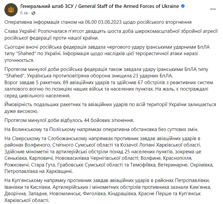 Розпочалася 526 доба повномасштабного російського вторгнення на територію України. За добу авіація Сил оборони України завдала дев'ять ударів по окупантах та їхній техніці, а також три удари — по ЗРК противника.