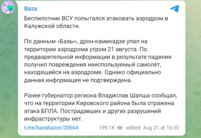 Безпілотник намагався атакувати аеродром у Калузькій області, що на території РФ. Сталося це вранці 21 серпня.