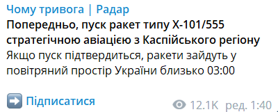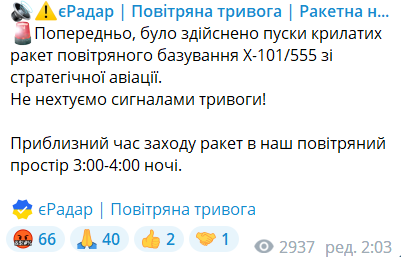 Оновлено 01:55. "Попередньо, пуск ракет типу Х-101/555 стратегічною авіацією з Каспійського регіону", — інформують моніторингові канали.