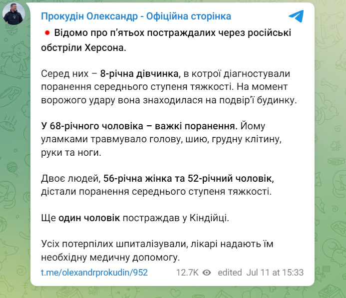 У Херсоні через ворожий обстріл збільшилась кількість поранених, — Прокудін