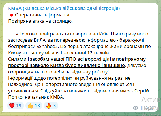 Оновлено 03:32. "Силами і засобам нашої ППО всі ворожі цілі в повітряному просторі навколо Києва було виявлено і знищено", — розповіли в КМВА.