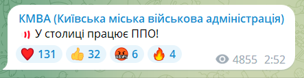 Оновлено 02:57. У КМВА підтвердили роботу ППО в столиці.