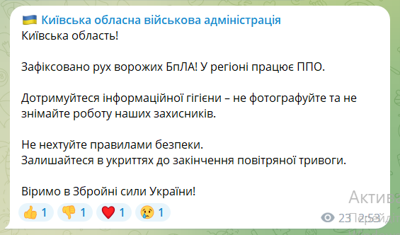 Оновлено 02:55. "Зафіксовано рух ворожих БпЛА! У регіоні працює ППО", — повідомляє Київська ОВА.