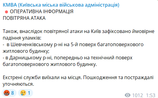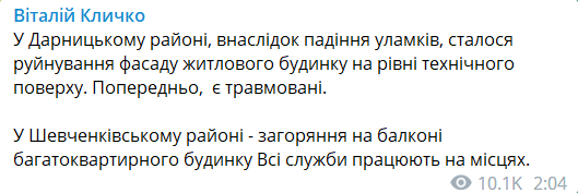 Оновлено 02:07. Кличко повідомив, що є травмовані мешканці, а також пошкодження житлового будинку в Дарницькому районі, у Шевченківському — пожежа, відповідні служби працюють на місцях.