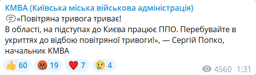 Також про роботу ППО на підступах до столиці повідомив начальник КМВА Сергій Попко.