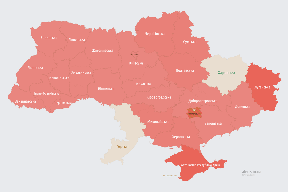 Нагадаємо, що вночі, 13 липня, в Україні оголошено повітряну тривогу. Наразі "почервоніли" майже всі області, є загроза атаки "Калібрів".