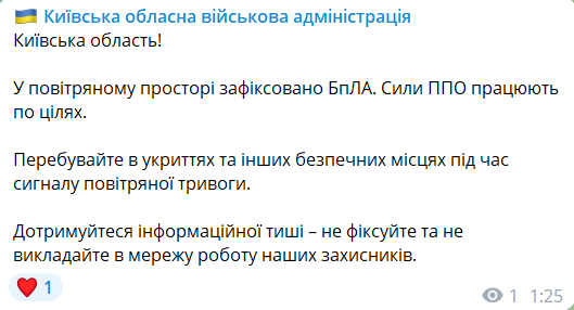 "У повітряному просторі зафіксовано БпЛА. Сили ППО працюють по цілях. Перебувайте в укриттях та інших безпечних місцях під час сигналу повітряної тривоги", — повідомили в Київській ОВА.