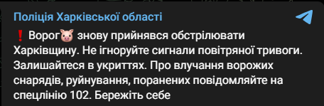 "Ворог знову обстрілює Харківську область", — йдеться у повідомленні.
