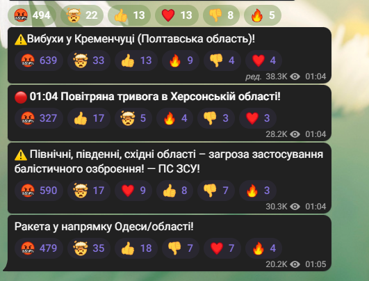 Моніторингові канали повідомляють про вибухи у Кривому Розі та Кременчуці на Полтавщині.