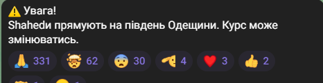 Повідомляється, що ворог цієї ночі затосовує також безпілотники. Повітряні Сили повідомляють про шахедів, які прямують на південь Одеської області.